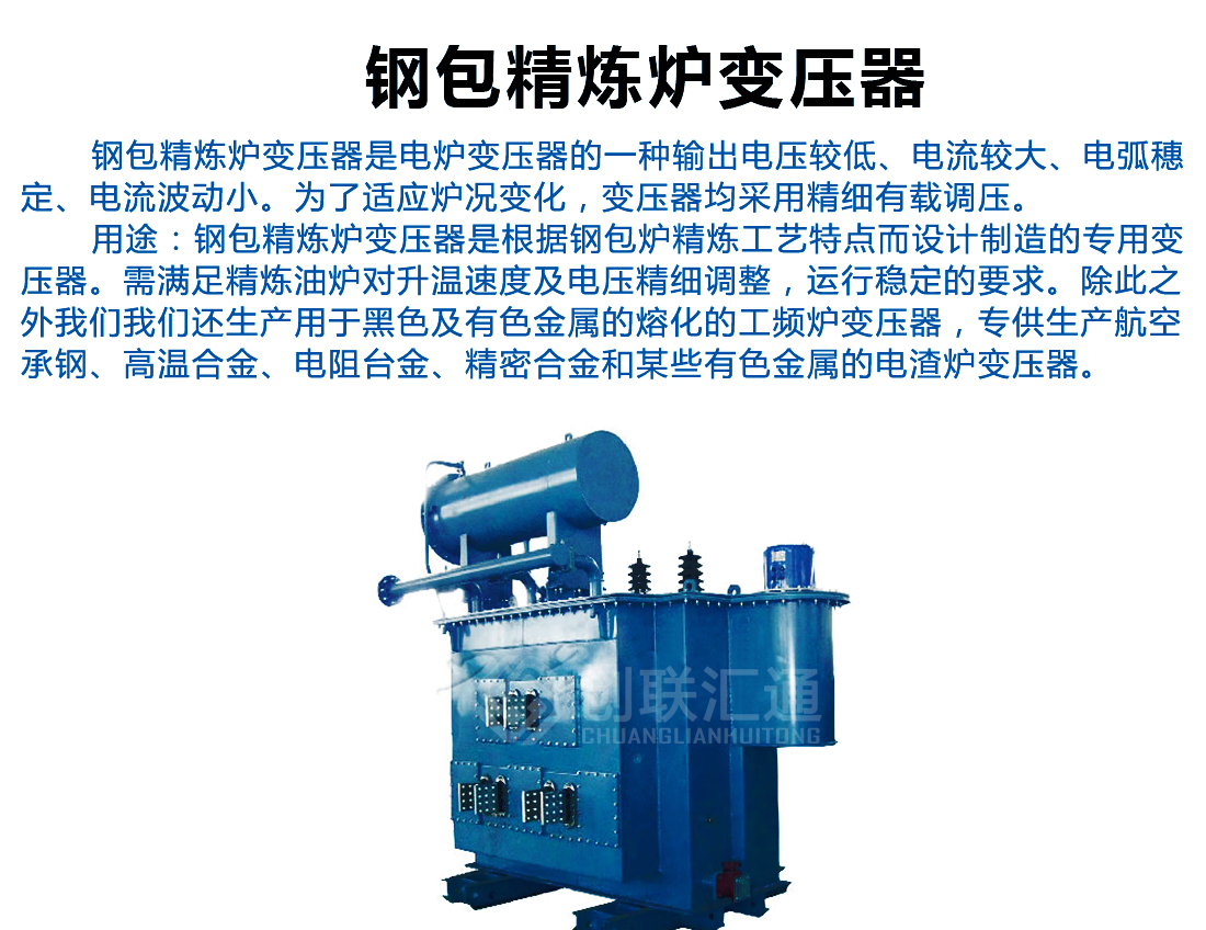 鋼包精煉爐變壓器是根據(jù)鋼包爐精煉工藝特點而設(shè)計制造的專用變壓器。需滿足精煉油爐對升溫速度及電壓精細(xì)調(diào)整,運行穩(wěn)定的要求。除此之外創(chuàng)聯(lián)匯通電氣還生產(chǎn)用于黑色及有色金屬的熔化的工頻爐變壓器,專供生產(chǎn)航空承鋼、高溫合金、電阻臺金、精密合金和某些有色金屬的電渣爐變壓器。
